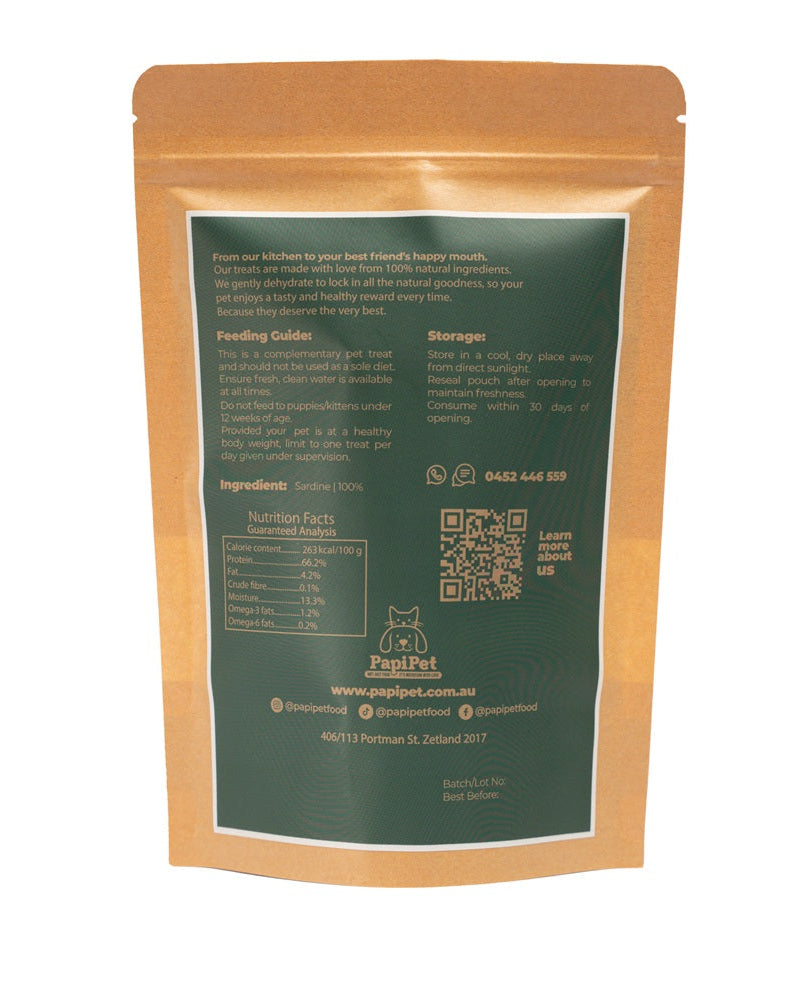 • 100% natural & single-ingredient – made from Australian-caught sardines.